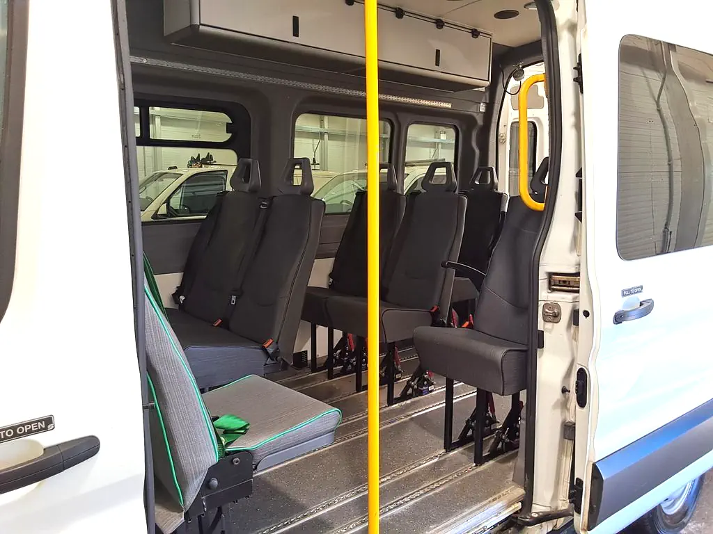 Fantastic L3 H3 Ford Transit Leader, expertly sourced by Minibus World and now ready to order. A full 9-seater vehicle which has 1 fixed seat and 8 removable to accommodate up to 3 wheelchair passengers. A Euro 6 compliant Minibus.