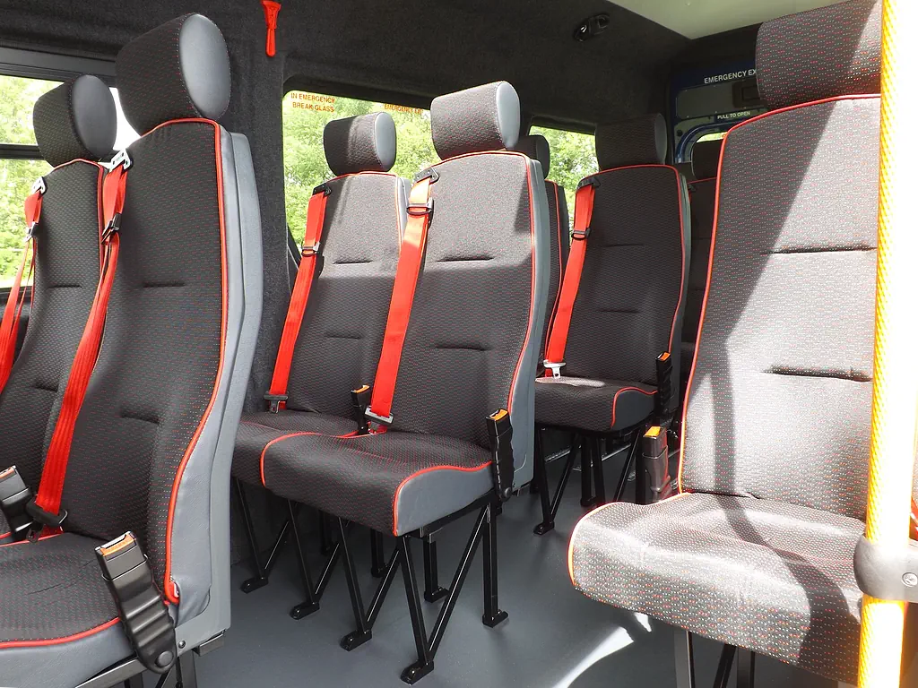 • 14 x M2 tested/certified seats in Peugeot Trim with Red Piping and Red Belts, with "all age" adjustable 3-point seat belts and headrest